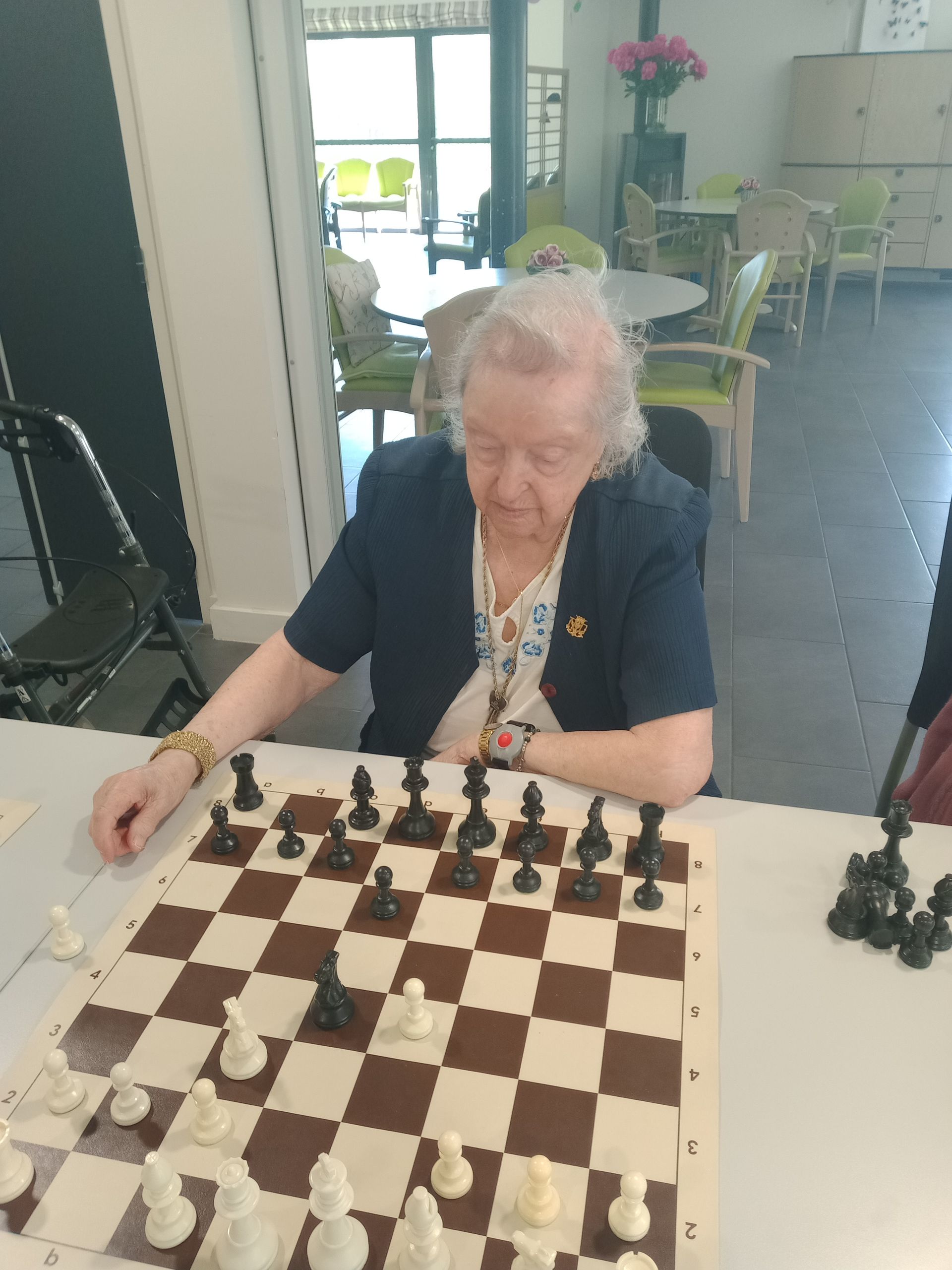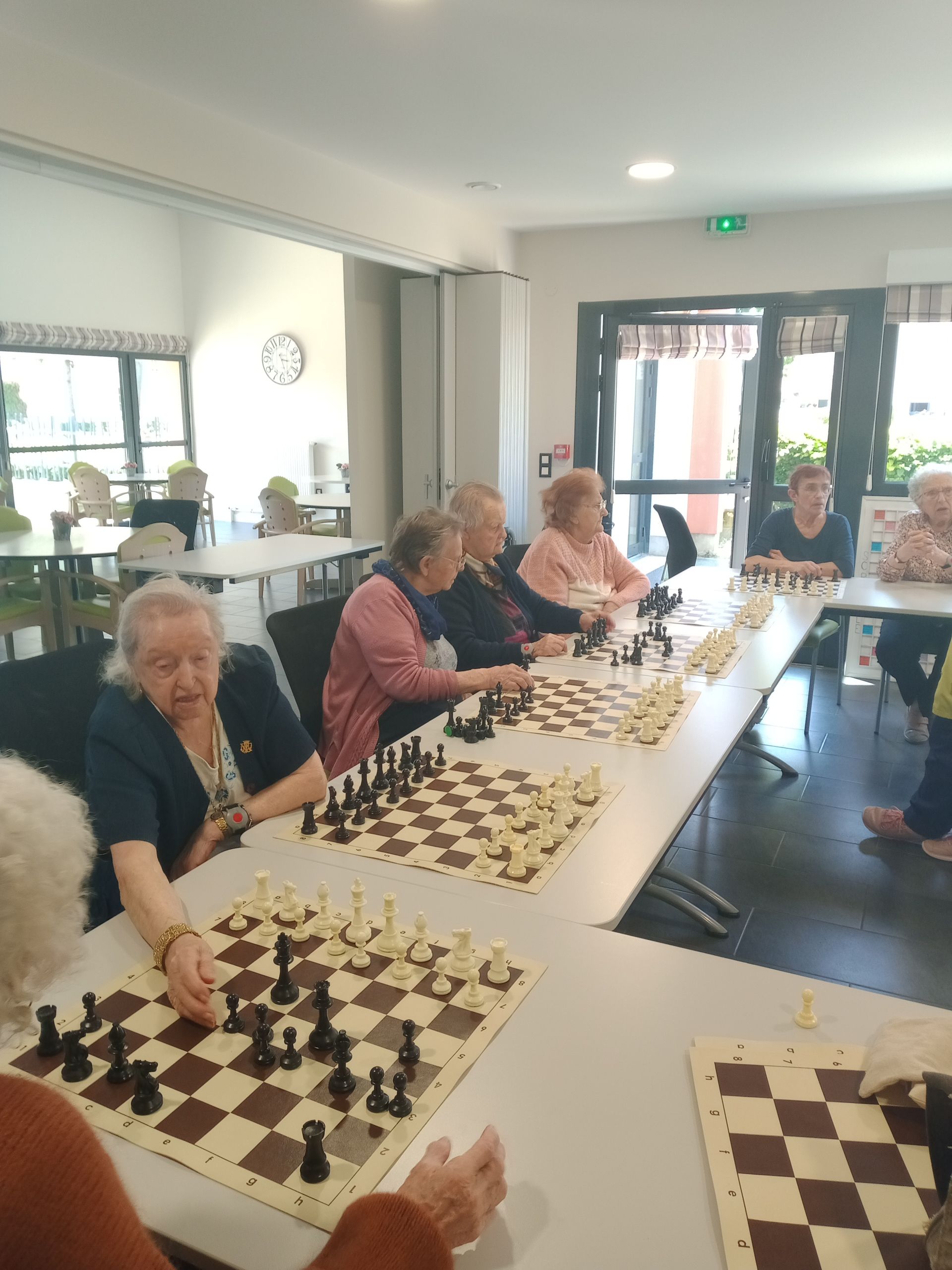 9 résidantes sont venues pour découvrir le jeu d'échecs. Présentation des pièces, déplacement du pion. A noter une résidente, Michèle 93 ans savait jouer et même si elle n'avait pas joué depuis longtemps elle avait encore de bon réflexe (règles d'or de l'ouverture, Tour sur colonne ouverte)