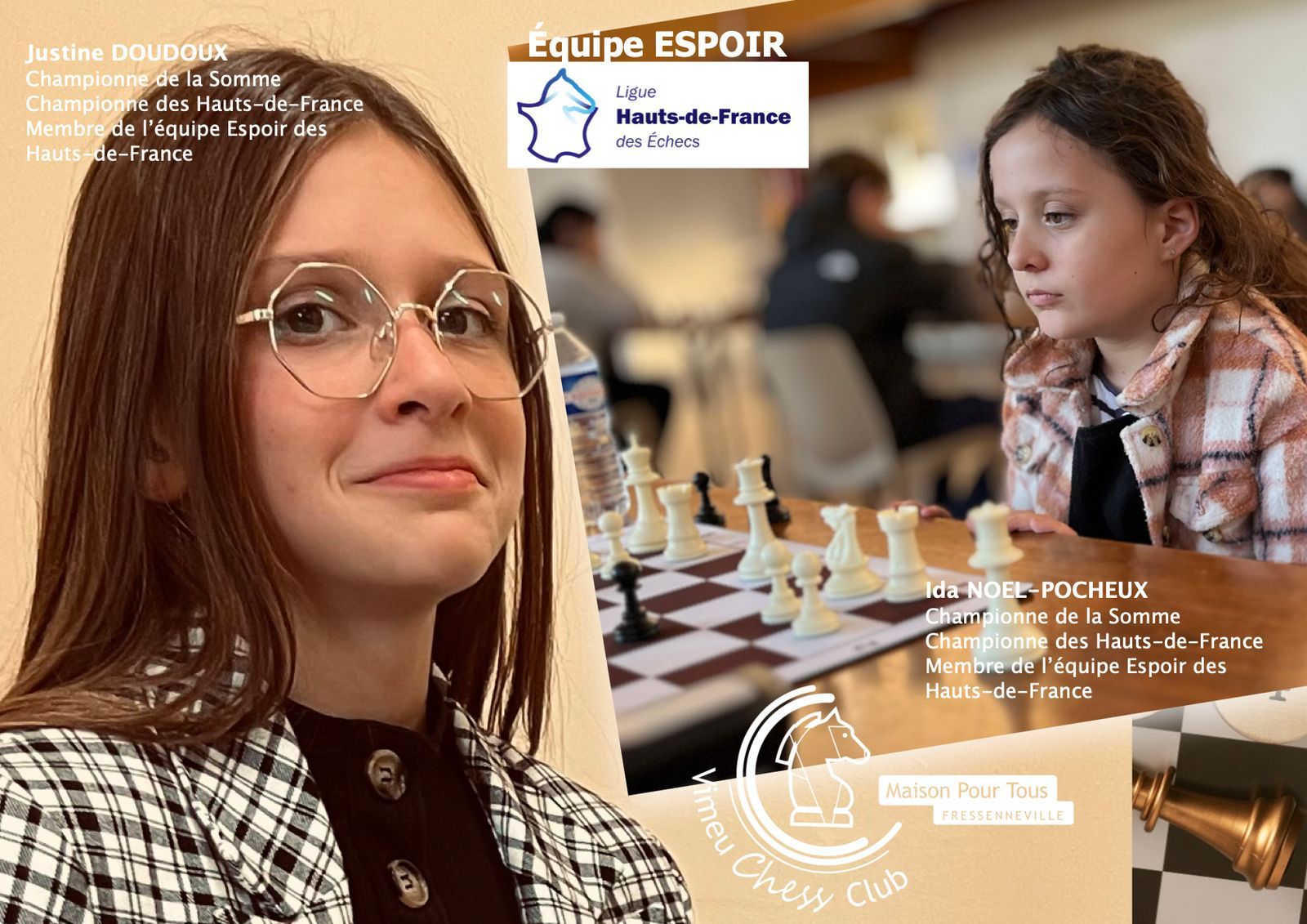 Du petit Poucet qui n’est autre qu’une petite poussine du Vimeu Chess Club (Adaline Vigreux, championne de la Somme U8) au grand méchant loup en U18 (Théo Constant, champion de la Somme), le club multiplie les podiums lors du championnat d’échecs de la Somme !!! Avec plus d’une dizaine de qualifiés au championnat des Hauts de France 🇫🇷, nous sommes très fiers des jeunes qui ont défendu nos couleurs avec un énorme cœur, force et honneur. Nos félicitations à Ida Noël-Pocheux et Justine Doudoux, championnes de la Somme, Énora Laboulais, vice-championne, Alexis Quernes et Léo Doucet, champions de la Somme, Camille Dacheux, vice-champion de la Somme ! En somme, qu’écrire de plus, sinon peut-être que la joie et le bonheur que vous apportez à tous est énorme !!! 😍 Mille mercis aux championnes de la Somme du dépassement de soi bénévole, Mary et Laure pour leur total investissement ! Merci et encore bravo à l’ensemble des jeunes, leur coach et leur famille !!! Merci à monsieur le sénateur pour son gentil message, à monsieur le conseiller départemental pour sa visite, à la municipalité et à la MPT de Fressenneville ! Merci Sylviane et monsieur Capon. En route vers SENLIS et AGEN !!! Merci 🤩 🫶